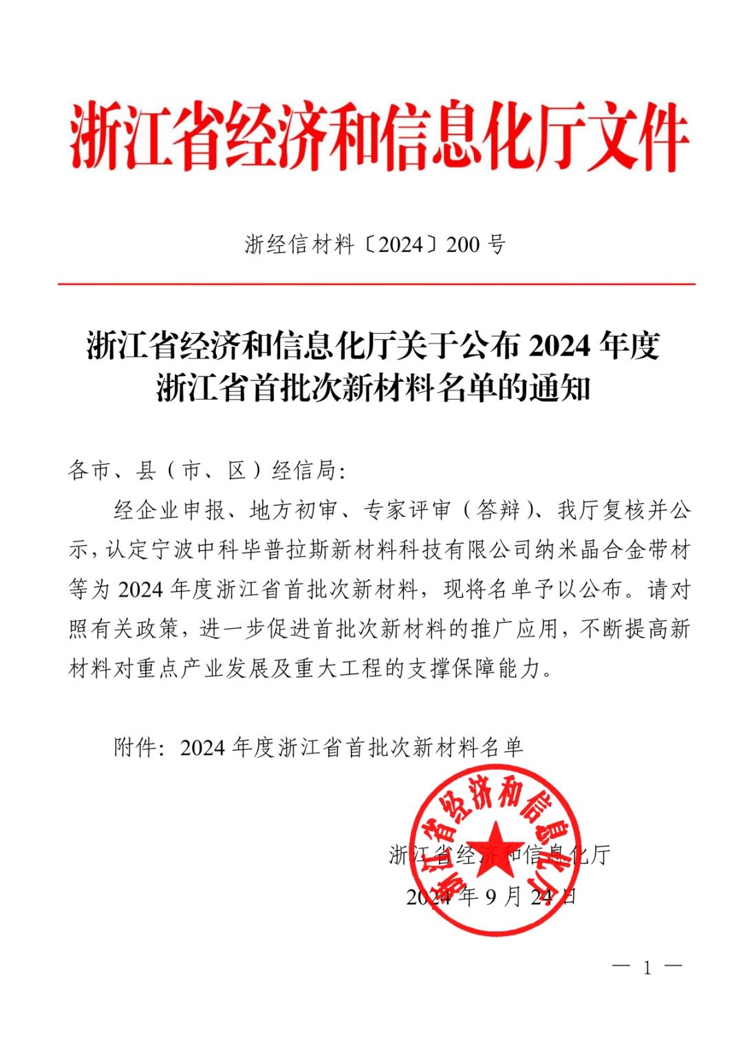 近日,浙江省经济和信息化厅公布了《2024年度浙江省首批次新材料认定结果》名单